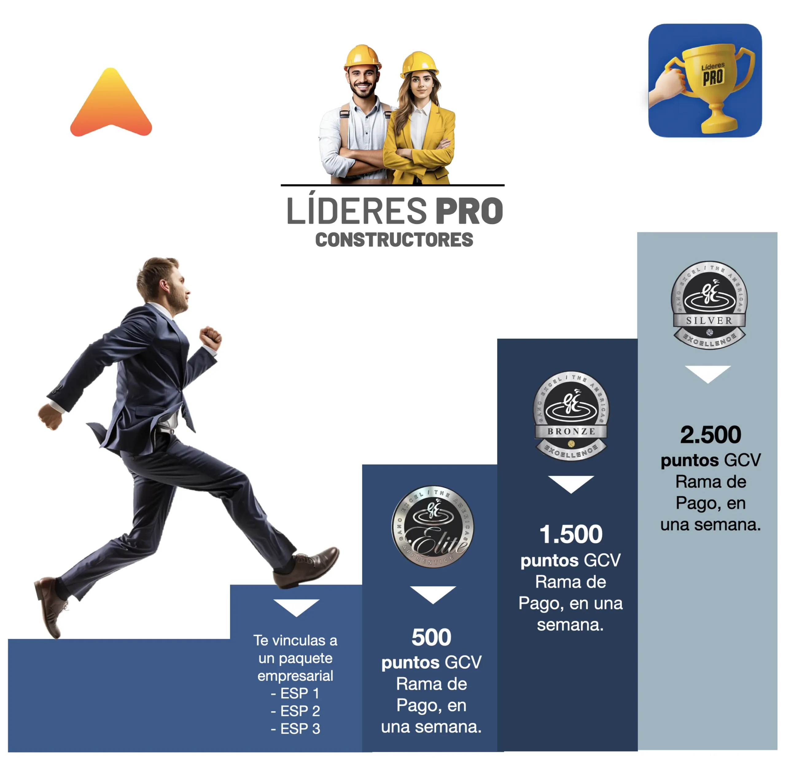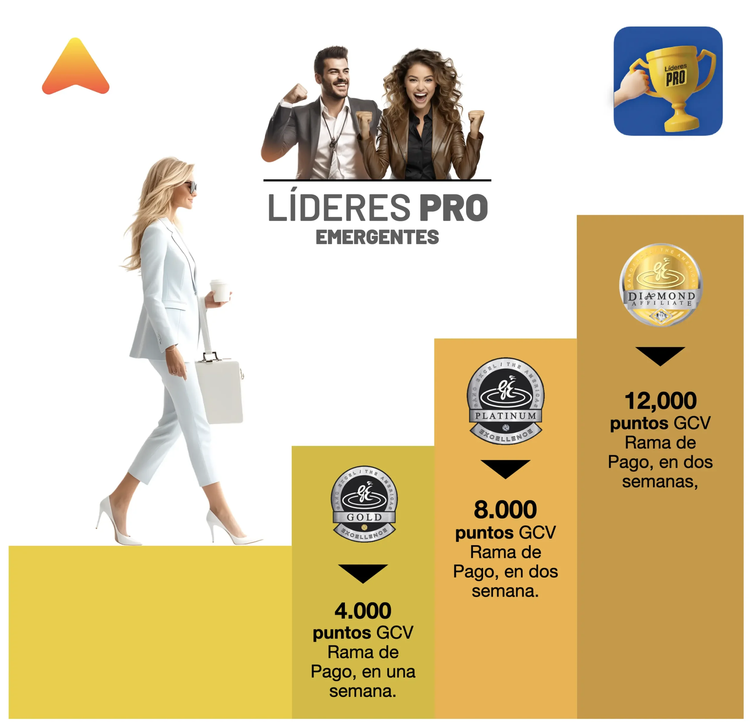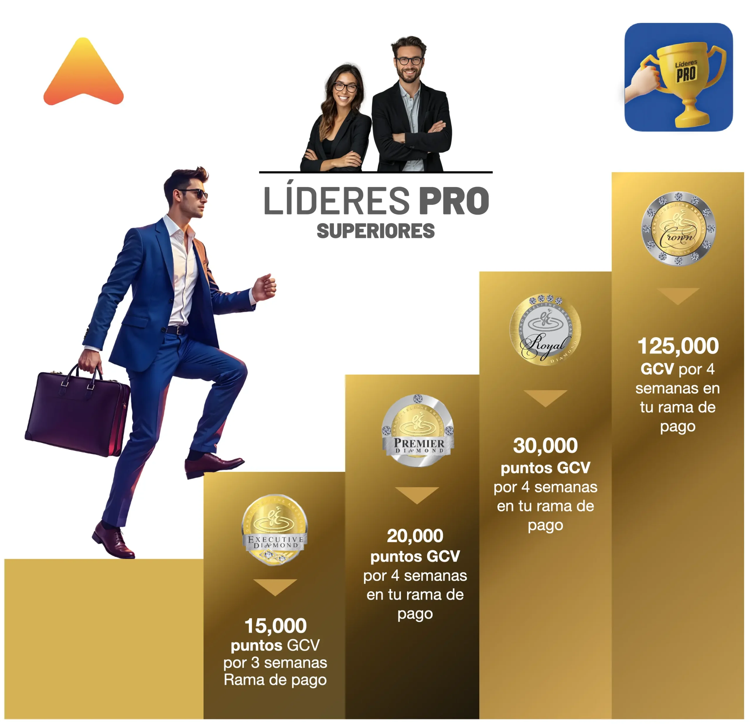 Aquí defines tu primera gran meta: alcanzar el rango de Asistente Ejecutivo (AE) lo más rápido posible. Esta metodología cuenta con tres principios: velocidad, repetición y ritmo. Aplicando estos principios cada semana, avanzas con firmeza hacia Bronce, Plata, Oro, Rangos emergentes y Superiores.