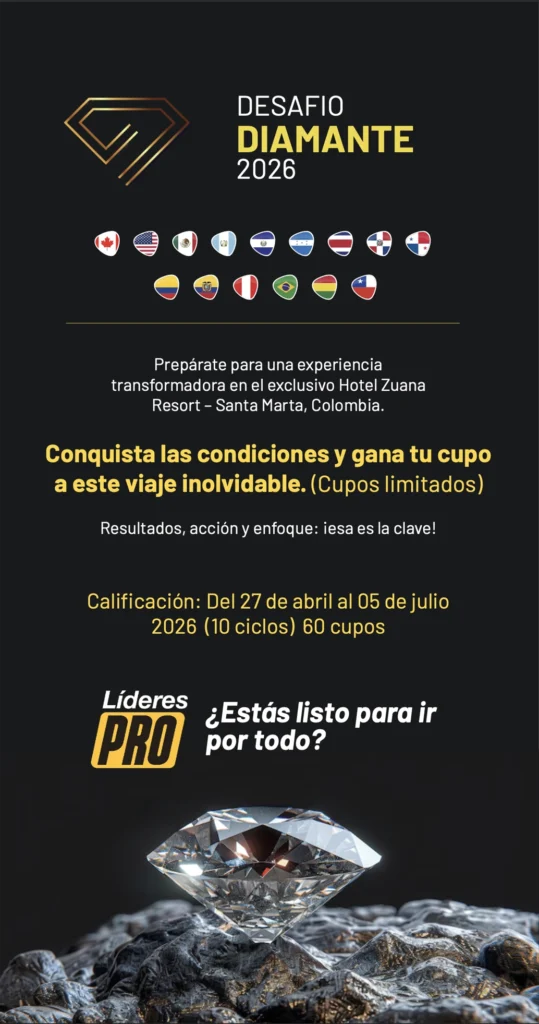 Cumbre DESAFÍO DIAMANTE – LÍDERES PRO La Experiencia que Despierta tu Grandeza y Multiplica tus Resultados Aquí se construyen líderes, rangos altos y mentalidades millonarias.MIRA EL VIDEO DE LA EXPERIENCIA ¿QUÉ ES DESAFÍO DIAMANTE ? •Un espacio diseñado para elevar tu mentalidad, expandir tu visión y fortalecer tu liderazgo.•La cumbre donde construimos rangos, lanzamos movimientos, generamos conexiones profundas y abrimos puertas a nuevos niveles de ingresos.No es una capacitación. Es una transformación. Una experiencia inmersiva donde te encuentras con tu verdadero potencial, tu liderazgo y tu abundancia. El lugar donde decides quién vas a ser en los próximos 12 meses. PARA QUIÉN ES ESTA EXPERIENCIA Esta cumbre es para personas que:✅ Aspiran a rangos altos✅ Están listas para generar más ingresos✅ Buscan liderazgo sólido y profesional✅ Quieren un equipo que avance unido✅ Desean vivir abundancia, visión y expansión✅ Están construyendo su mejor versión empresarial LO QUE VAS A VIVIR Un viaje de inmersión para alinear tu mentalidad con tu éxito•Activaciones de mentalidad millonaria•Sesiones de liderazgo de alto impacto•Prácticas vivenciales de crecimiento personal•Estrategias para la construcción de rangos•Herramientas para el desarrollo empresarial•Dinámicas de trabajo en equipo•Anuncios y lanzamientos exclusivos del equipo Líderes Pro Tu vida cambia cuando te rodeas de personas que ya viven lo que tú sueñas. En Desafío Diamante te conectas con la frecuencia de la abundancia:✔ Ambientes de éxito✔ Líderes que ya están logrando resultados extraordinarios✔ Energía de visión, prosperidad y expansiónLa abundancia se transmite. La abundancia se duplica. Si tu negocio se estanca, no es falta de talento… es falta de visión y ambiente. Estar en este evento te da:✅ La claridad que tu negocio necesita✅ La mentalidad para avanzar de rango✅ Conexiones que multiplican tus ingresos✅ Una misión que tu equipo seguiráUn líder que no se expande… limita a su equipo.Un líder que asiste… arrastra a su equipo a crecer. Resultados, acción y enfoque: ¡esa es la clave! Conquista las condiciones y gana tu cupo a este viaje inolvidable. (Cupos limitados) Cumbre de Constructores Cumbre de Emergentes Cumbre de Superiores